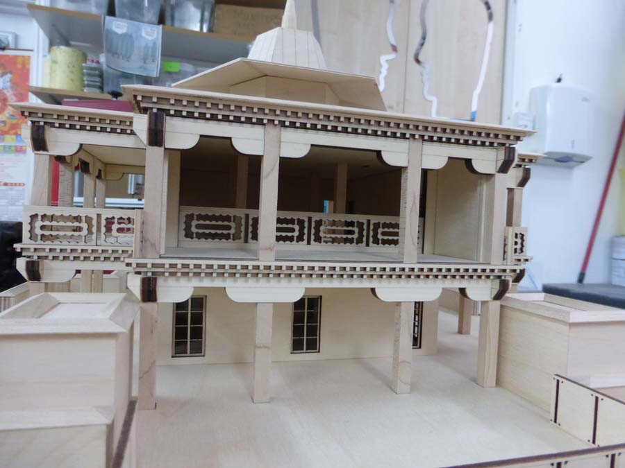 We created the 1:50 model using a laser cutting technique with woods and veneers. The laser cutting produced a burnt effect to enhance the details.