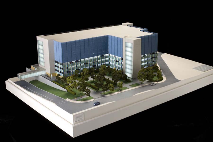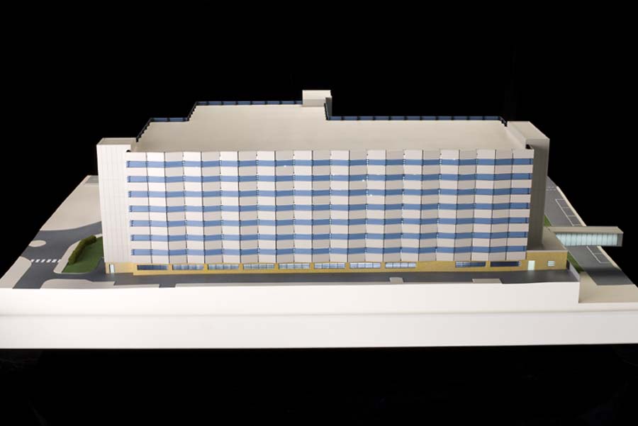 1:100 Scale model of Addenbrookes University Hospital, Cambridge’s new multi-storey car park facility provides a total of 1,050 parking spaces over seven levels. Designed by R G Carter.